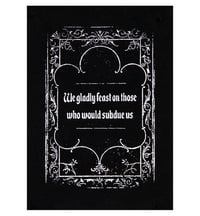 Inspired by silent films and the Addams family credo, it's screen printed on raw-edged black heavyweight cotton fabric.